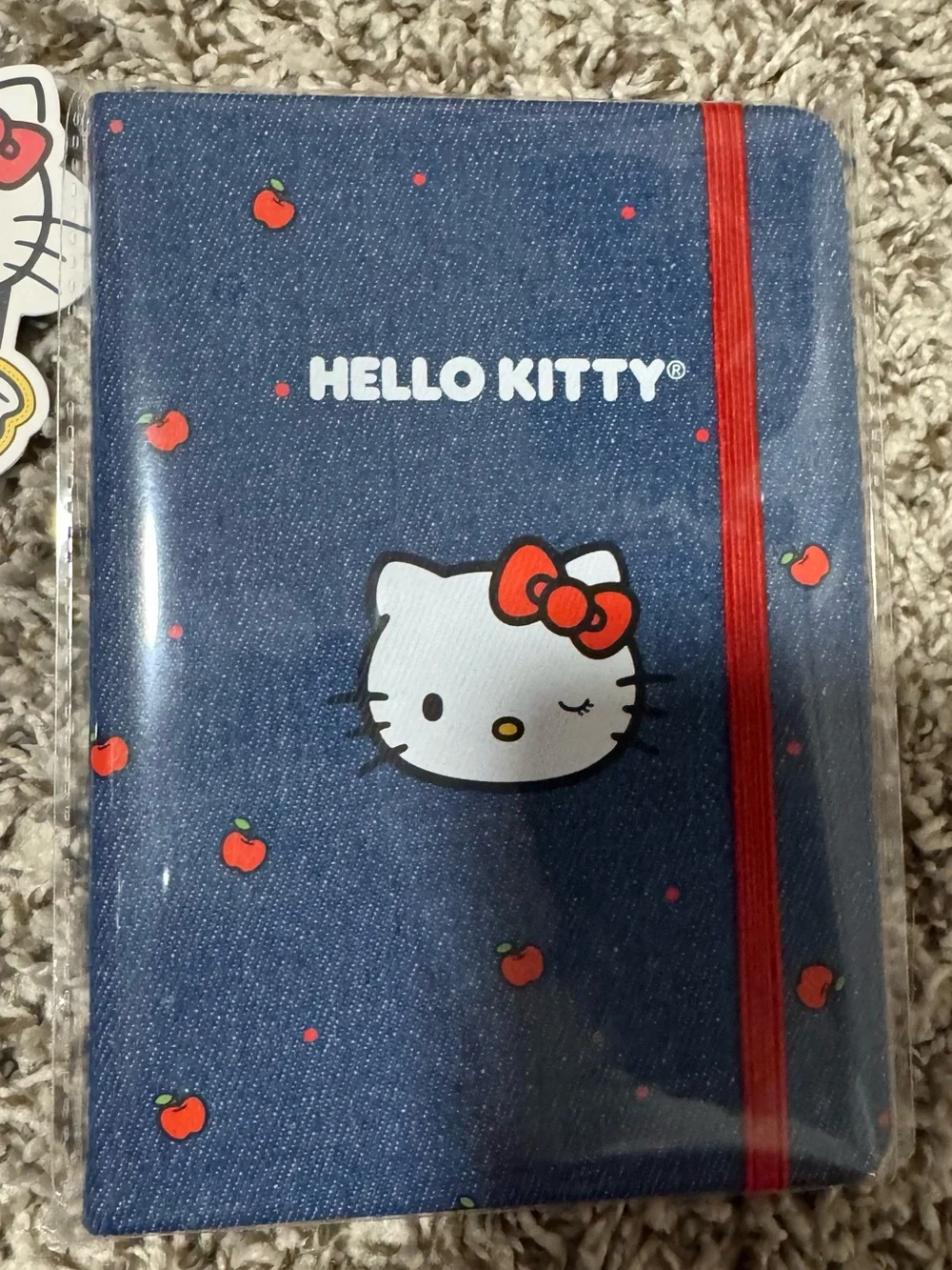 Hello Kitty blue denim-style notebook case with red elastic strap and red apple accents. Features Hello Kitty branding and cute printed design. Protective, stylish accessory that adds playful charm to your device.