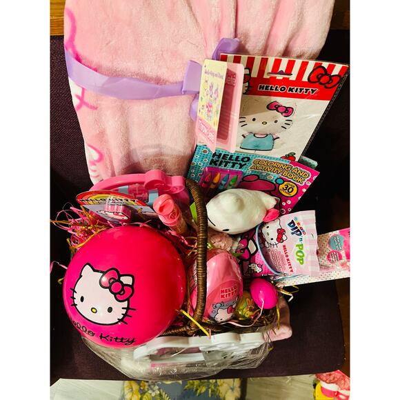 Hello kitty Easter bundle 60 70 pink Easter throw , color book and crayons ,bubble wand ,ballon , HK PEN , ball , HK 200 jewelry accessories, 1 large pink plastic egg , 2 small ones , toothbrush and cap , small plastic HK cup , Dip n pop , small Hello Kitty plush and light up Hello Kitty shape light up . All items are new . Can modify or add to bundle . Thank you !