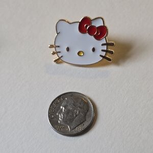 Adorable Hello Kitty pin featuring a charming red bow and classic white face. Perfect for adding a touch of fun to any outfit.