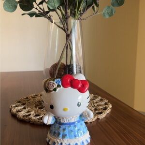 Charming Hello Kitty vase by Blue Sky. Features red and blue accents. Perfect for adding a playful touch to your decor.