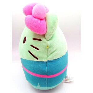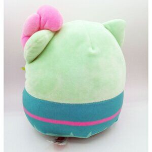 A cute 8" Hello Kitty Frankenstein Plush toy, perfect for Halloween is made by the reputable Squishmallows brand, and has a green body and hot pink bow.