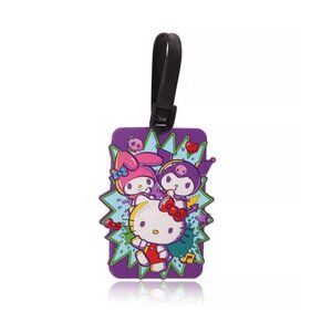 Cute and colorful luggage tags featuring Hello Kitty and friends, ideal for personalizing bags. Made of durable PVC with adjustable straps for secure attachment.