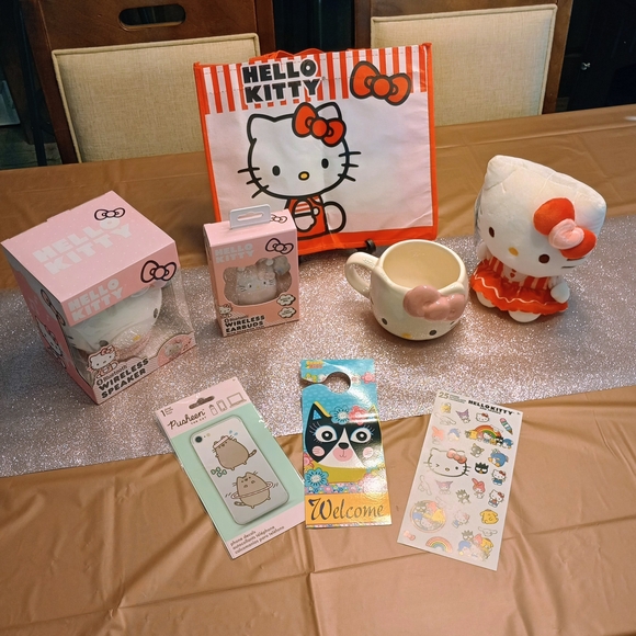 Cute Hello Kitty Gift Set. Includes themed tote, wireless speaker, wireless headphones mug, plush and stickers. Pink and white color scheme. Charming for birthday parties, Easter, and gift giving.