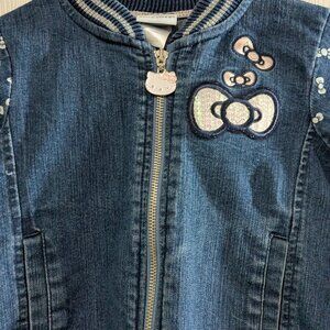 Hello Kitty girl's denim jacket in blue with white Hello Kitty print on sleeves, featuring a sequin logo on the back and a Hello Kitty zipper pull. Designed with long sleeves, stretchy bands at wrists and hem, full zip front, and two front pockets. Made from a cotton, polyester, and spandex blend. Machine washable. Pre-owned in excellent condition. Measures approximately 13" armpit to armpit, 16" from center back of neck to hem, and 16" sleeve from shoulder seam to cuff.