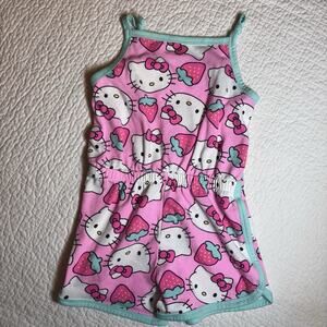 Hello Kitty Girls' Sleeveless Romper Pink Strawberry Print Teal Trim Sz LG 10/12