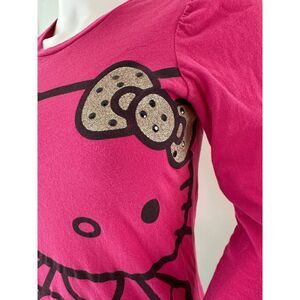 Hello Kitty Gold Glitter Rhinestone Bow Long Sleeve Graphic Tee Shirt Pink Top size Junior Extra Small