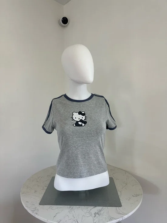 Soft grey ringer tee with navy trim and a cute Hello Kitty graphic at the chest. Comfortable cotton-blend fabric for everyday wear. Classic short sleeves and a relaxed fit for easy movement. Easy to pair with jeans or shorts.