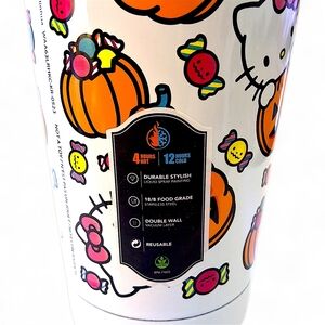 Add some spooky-cute vibes to your drinkware with this Hello Kitty Halloween tumbler featuring adorable pumpkins, candy, and your favorite Sanrio icon! π Crafted from 18/8 food-grade stainless steel with a double-wall vacuum layer to keep drinks hot for up to 4 hours or cold for up to 12 hours. Comes with a secure, clear lid β perfect for sipping on the go!