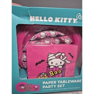 Ships quick! The Hello Kitty Halloween Paper Tableware Party Set includes 16 lunch plates, 16 dessert plates, and 40 napkins, all featuring the beloved Hello Kitty character in a fun Halloween theme. Made of paper and in English language, this collectible set is perfect for fans of the Hello Kitty franchise. The hot pink color adds a vibrant touch to the cartoon and TV character-themed party supplies, making it a must-have for any Hello Kitty enthusiast looking to add a touch of cuteness to their Halloween celebrations.