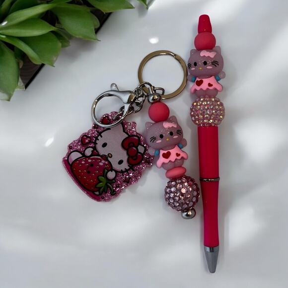Hello Kitty Handmade Beaded Ballpoint Pen & Matching Keychain