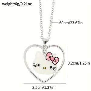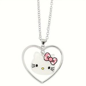 Charming Hello Kitty pendant in a heart frame. Features a pink bow and silver chain.