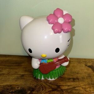 Hello Kitty in a hula outfit. Pink flower on head. Green grass skirt. Holding a red ukulele.
