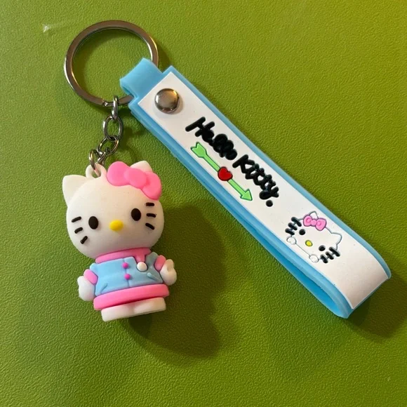 Charming Hello Kitty keychain with pink bow and blue outfit. Ideal for fans of cute accessories.
