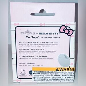 Hello Kitty LED Compact Magnifying Mirror. LED light simulates daylight for more accuracy. Tap on/off button. Press button down to adjust brightness. Top mirror has 3X magnification.