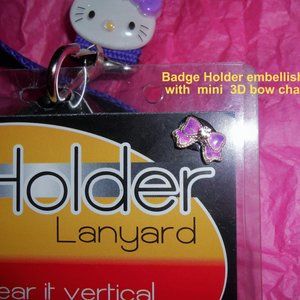 Purple lanyard embellished with home-designed resin Hello Kitty face. ID badge display compartment is adorned with a mini crystal bow charm, and it's purple, too!