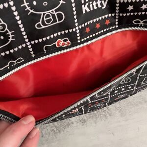 This Hello Kitty duffle bag is perfect for travel, weekend or overnight getaway or for a school bag. The bag features a zip closure and an adjustable shoulder strap for easy carrying. The black, white, and red exterior color scheme is accented with chrome hardware and a charming bag charm. Inside, the bag is lined with nylon and includes a front pocket for additional storage. The lightweight design ensures that it's easy to carry, while the approximate size of 8" wide 15" high and 23" length provides ample space for all your belongings. This Hello Kitty duffle bag is a great accessory for any fan of the iconic character.