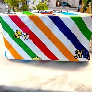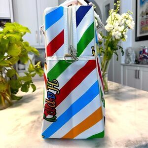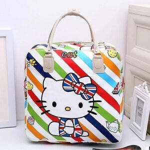 This is a Hello Kitty Lightweight Large Travel Bag Tote UK Union Jack Rainbow Bag in Faux Leather. Brand New. Only 2 available. Zippered at the top with two carry handles that snap together for easy carrying.
