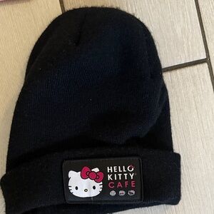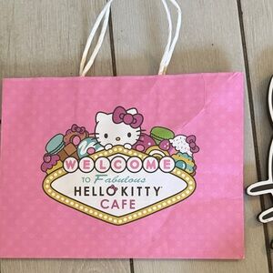 Charming Hello Kitty set with a pink gift bag and black beanie. Features iconic Hello Kitty design. Beanie purchased in Las Vegas HK Cafe.