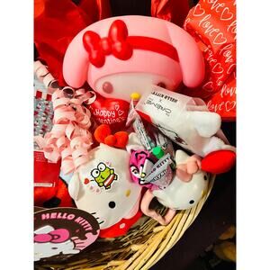 Hello Kitty Love basket 50 x 70 plush throw HK gummy hearts my melody light up blow mold ,Hello Kitty headband ,Hello Kitty face mug ,Hello Kitty plush ,socks ,chap stick and HK ring pop .Ill provide a clear gift bag .Basket included . Ready to ship .Makes a great gift . Thank you !