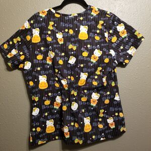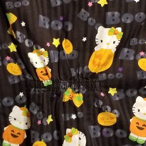 Hello Kitty Womens Size Medium Scrub Top 100% Cotton Elastic Cinch in Back Black Fall Halloween Pumpkin Boo
