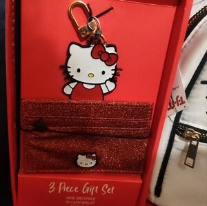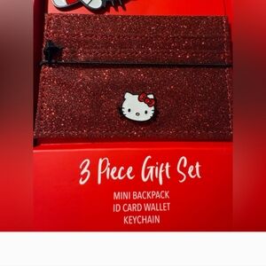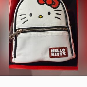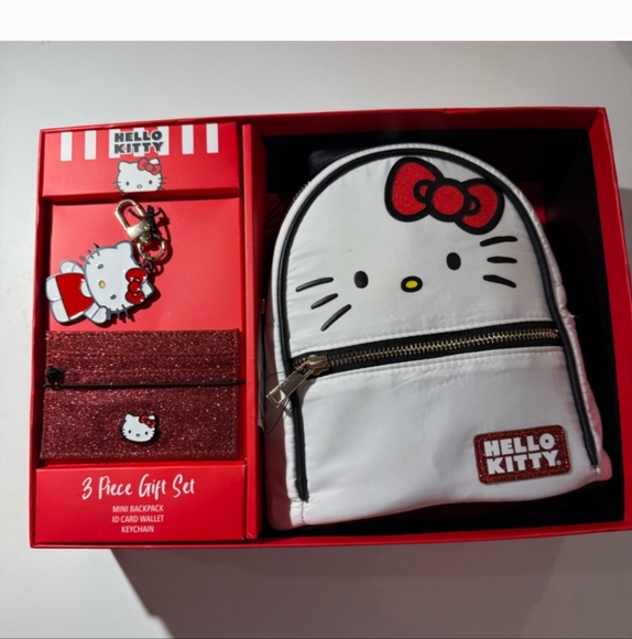 Just in time for the Holidays! Adorable white Hello Kitty Mini Backpack. The backpack depicts Hello Kitty's face. It comes with a sparkling red ID Wallet and Hello Kitty Key Chain.