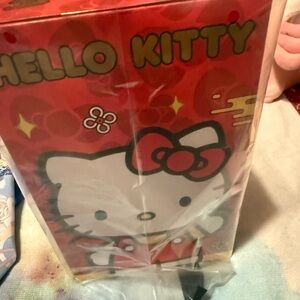 Hello Kitty themed sign with multilingual safety warnings. Features bold red and yellow text.