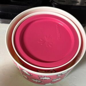 These are actual Tupperware brand containers with a Hello Kitty design. They are 1.5 quart, 1 quart and 2 cup size. They nest inside each other for storing when not in use.