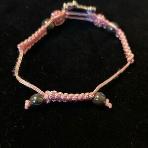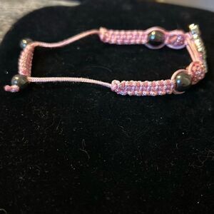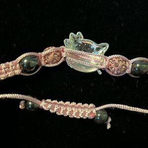 This Hello Kitty bracelet is the perfect accessory for any fan of the cartoon character. The pink color and adjustable feature make it a versatile piece. The kitty face charm and braided cord chain type add to the unique look of the bracelet. The rhinestone and hematite stones make it a statement piece that will catch the eye of anyone who sees it. NWT