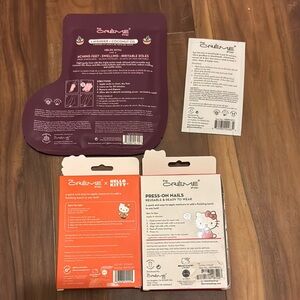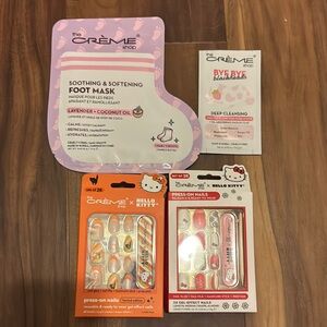 Adorable Hello Kitty beauty set in pink. Includes foot mask, deep cleansing pore strip, Halloween limited edition hello kitty nails, limited edition classic hello kitty nails, and pink hello kitty cosmetics bag.