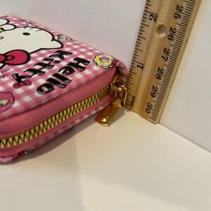 Brand New Hello Kitty wallet. Measures approximately 4 inches in width by 3 1/2 inches in length. Has two compartments, with slots for 4 card slots and a zippered coin .