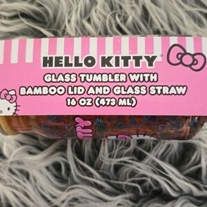 Adorable Hello Kitty pink glass tumbler with matching bamboo lid and reusable straw. Features the classic Hello Kitty face with bow and colorful printed background design. Perfect for fans and collectors!