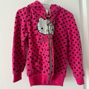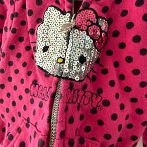 Adorable pink hoodie with black polka dots. Features a sequined Hello Kitty design. Perfect for fun outings.