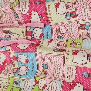Adorable flannel pajama bottoms with Hello Kitty print. Features pink and green colors in a comic strip style. Perfect for comfy, cozy lounging.