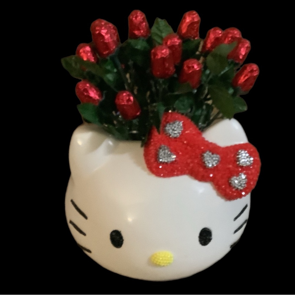 Charming Hello Kitty planter featuring vibrant red roses. Perfect for adding a cute touch to any space.