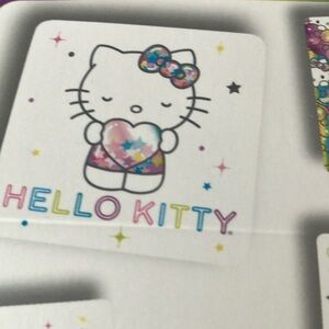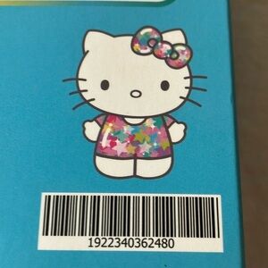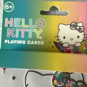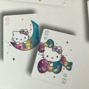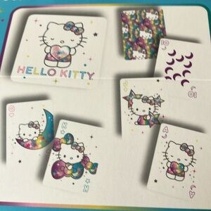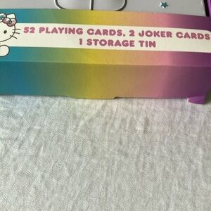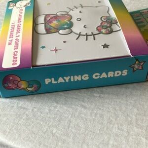 Hello Kitty playing cards set with colorful design. Includes 52 cards, 2 jokers, and a storage tin.