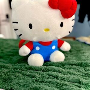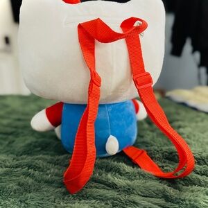 Adorable Hello Kitty plush backpack. Features a vibrant red bow and blue outfit. Perfect for kids.
