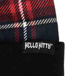 The Hello Kitty Punk Magic Jacquard Plaid Crown with Embroidered Cuff and Black Pom Beanie features embroidered artwork of Hello Kitty on the front cuff and an all-over red and black plaid patterned crown.