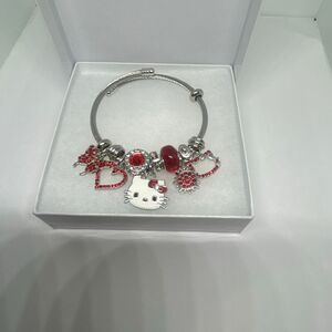 Adorable Hello Kitty charm bracelet featuring bright red accents, sparkly rhinestones, and fun decorative charms. Perfect for any Hello Kitty fan or as a sweet gift!