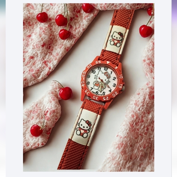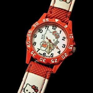 with a red bezel and white logo strap. Features Hello Kitty design on the face and strap.