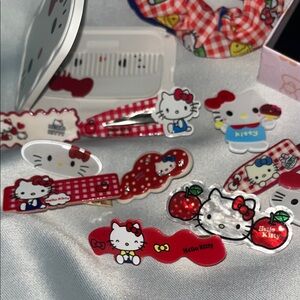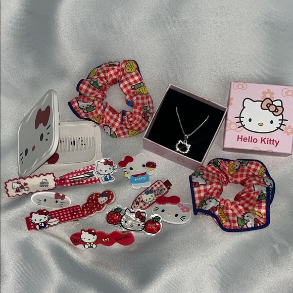 Adorable Hello Kitty set with necklace, scrunchies, and clips. Features cute designs in red and pink.