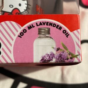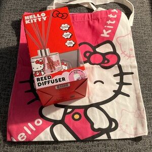 Cute Hello Kitty tote bag with matching reed diffuser. Features pink and white design with Hello Kitty graphics.