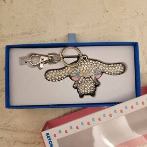 Charming Hello Kitty Keychain. Pink exterior with blue ribbon accent. Lots of bling.