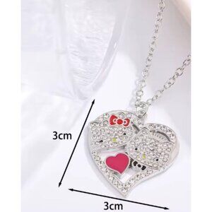 Add a touch of sparkle and sweet charm to your collection with this Hello Kitty rhinestone heart and key necklace. Featuring Hello Kitty's iconic silhouette delicately crafted into a shimmering heart and key pendant, this piece is perfect for fans, collectors, and lovers of kawaii fashion.