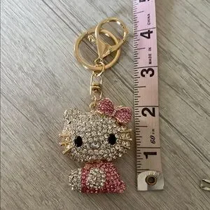 Sparkling Hello Kitty keychain adorned with rhinestones. Features pink and silver accents. Perfect for adding charm to your keys.