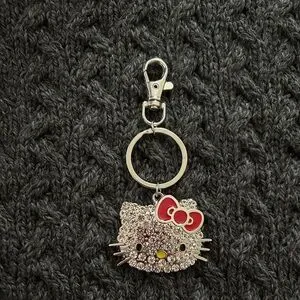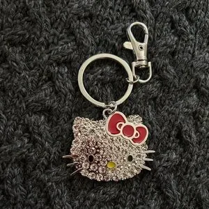 Sparkling Hello Kitty keychain with rhinestones. Featuring her signature red bow and silver accents.