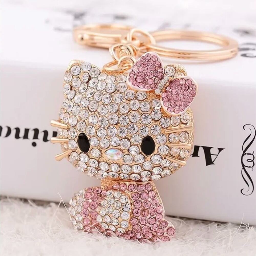 Sparkling Hello Kitty keychain with rhinestones. Features pink and clear stones. Perfect for adding charm to your keys.