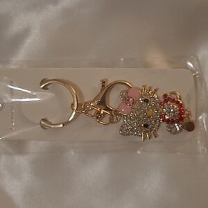 Sparkling Hello Kitty keychain with rhinestones. Features pink, red, and gold accents. Perfect to wear on bags. backpack, water bottles, and more!