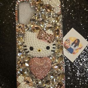iphone 16 plus Sparkling Hello Kitty phone case with rhinestones and pearls. Features pink and silver accents.