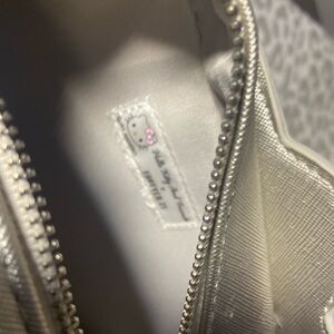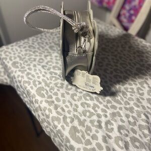 Sparkling Hello Kitty purse with rhinestones. Features a blue bow and silver accents.