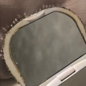 Preowned Hello Kitty compact mirror. The compact has a few imperfections such as the top mirror not glued on the compact and the compact does stay closed so you have to hold it carefully when opening. Some stones missing but not noticeable unless you’re looking for it. Comes with 2 hair clips, 2 rings, one bracelet and pearl necklace.